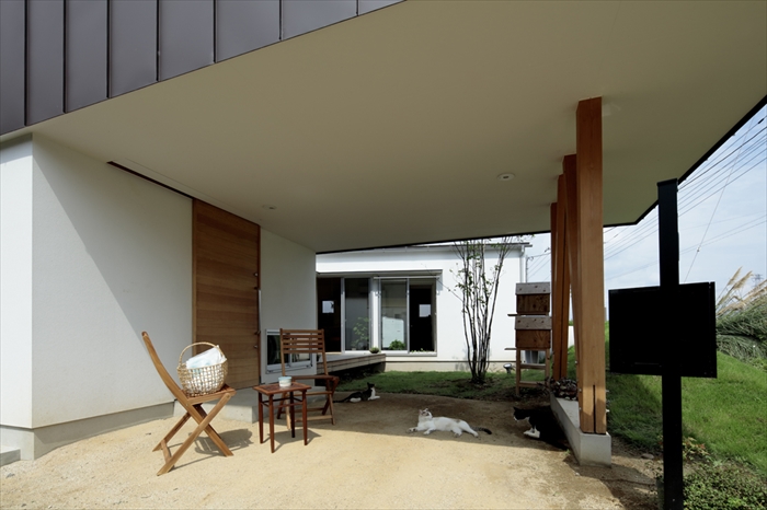 中庭へつづくエントランスのピロティは、昔のいえの縁側の下のような、土間のような場所。虫かごをおいたり、雨を眺めたり。 ただの入り口ではなくて、活動の場。なにかの居場所。