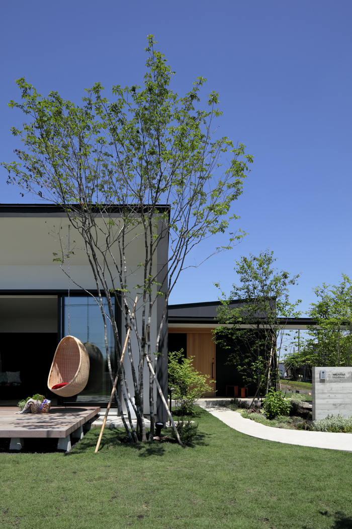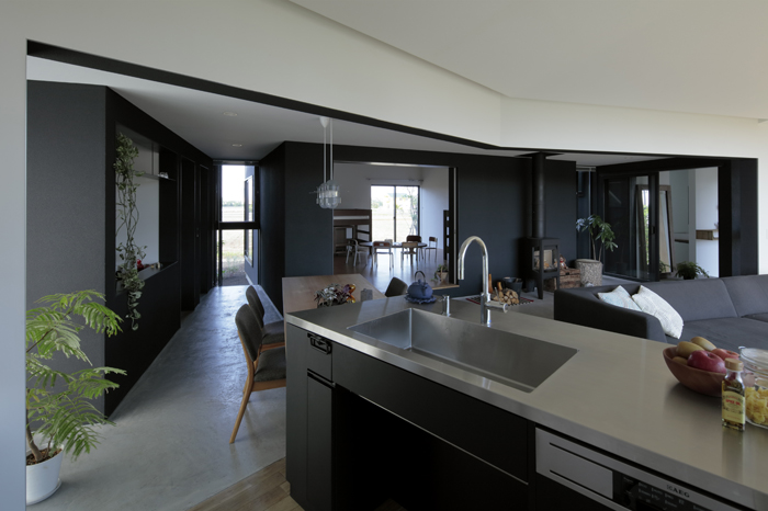から護られ、より落ち着いた場所となる。各ボリュームはそれぞれ異なり、水廻りの場、子供達の場、主寝室の場、リビング・ダイニングの寛ぎの場となっており、内部土間を介しそれぞれの場を行き来する。