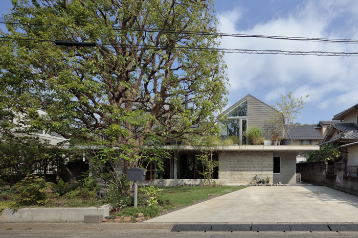 この画一的な住宅地の中で、クスノキが大きなシンボルであり、建物は居丈高に振舞うのではなく、街の中に埋まり、クスノキの傘の下に身を潜めたいと思った。
