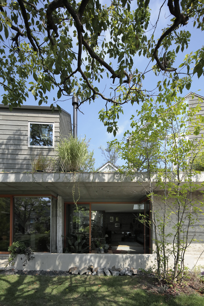 庭より少し下がった1階は地面がより目線に近く、植栽などの緑がより身近になる。クスノキは見上げる形になり、その枝葉の下に入り込む。コンクリートの表情と共に伸ばした庇がより安心感と安定性を強くしている。